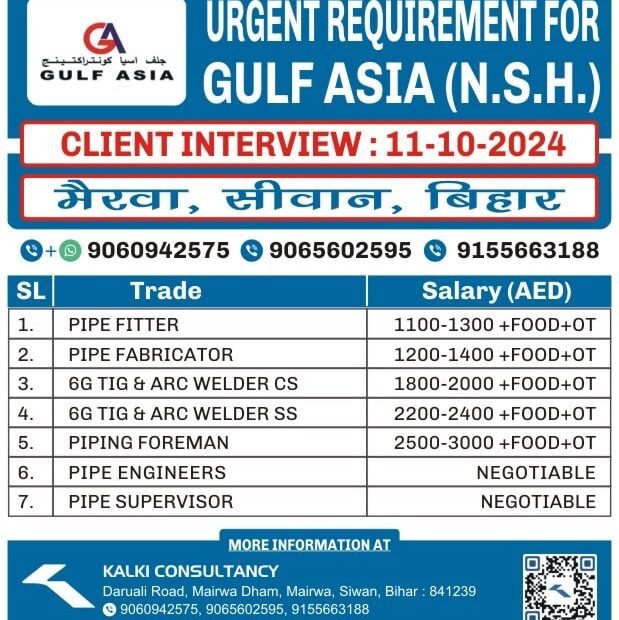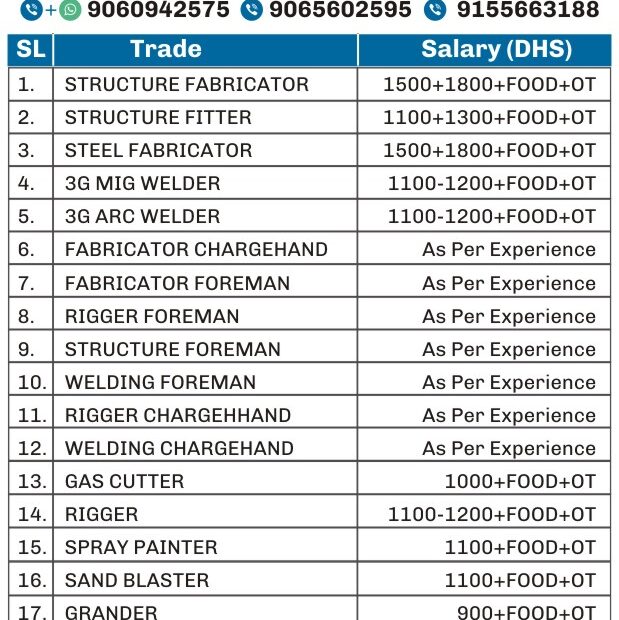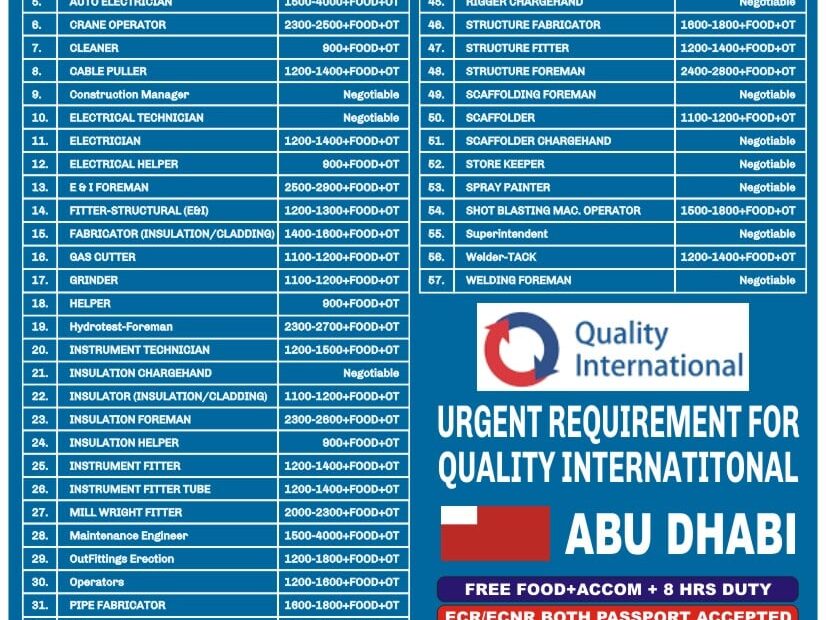 I'm Interested for this jobNot relevant Trade Mobile Number Upload PDF* URGENT REQUIREMENT FOR QUALITY INTERNATIONAL ABH DHABI Client Interview 19-11-2024 SL Trade Salary (UAE)… Read More »URGENT REQUIREMENT FOR A LEADING COMPANY, ABU DHABI – Posted on : 15-11-2024