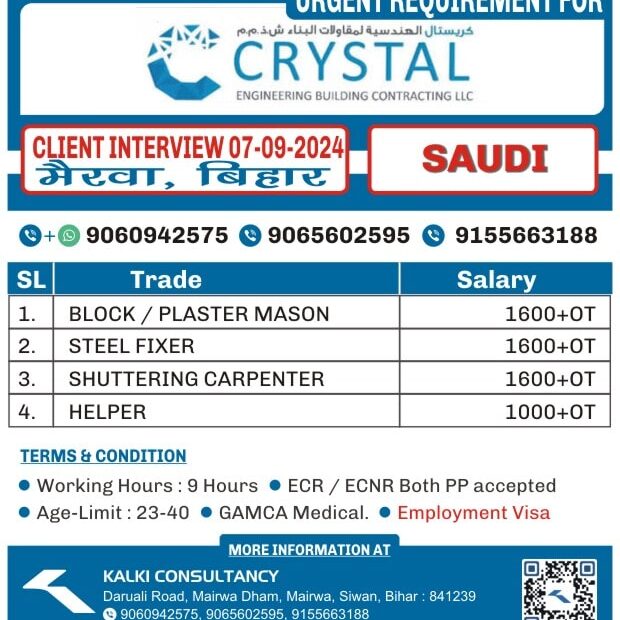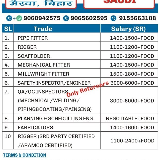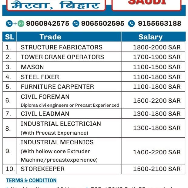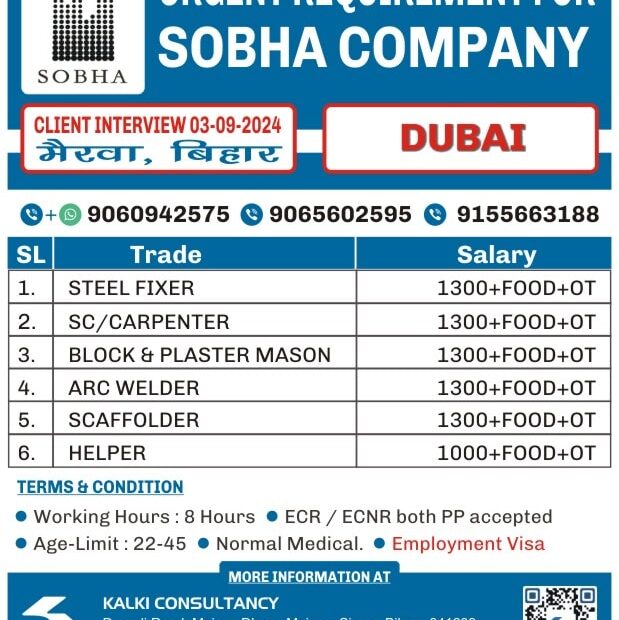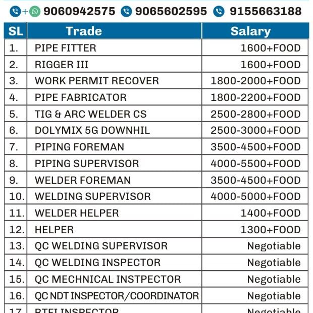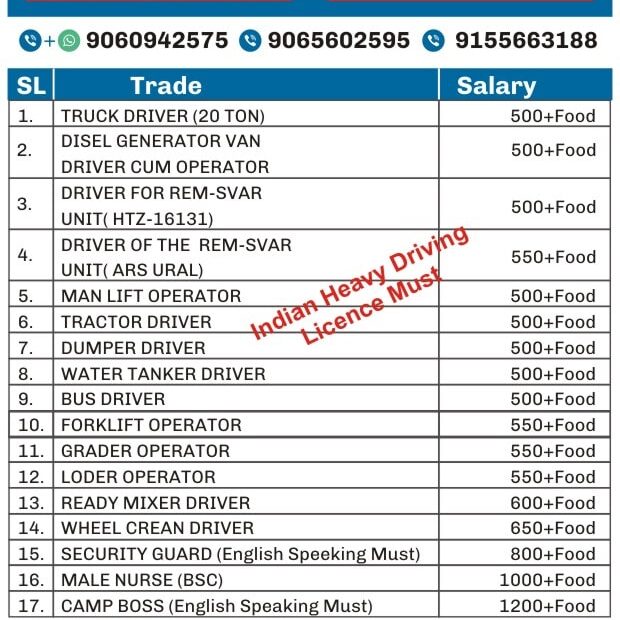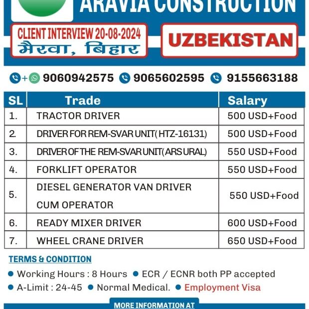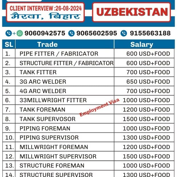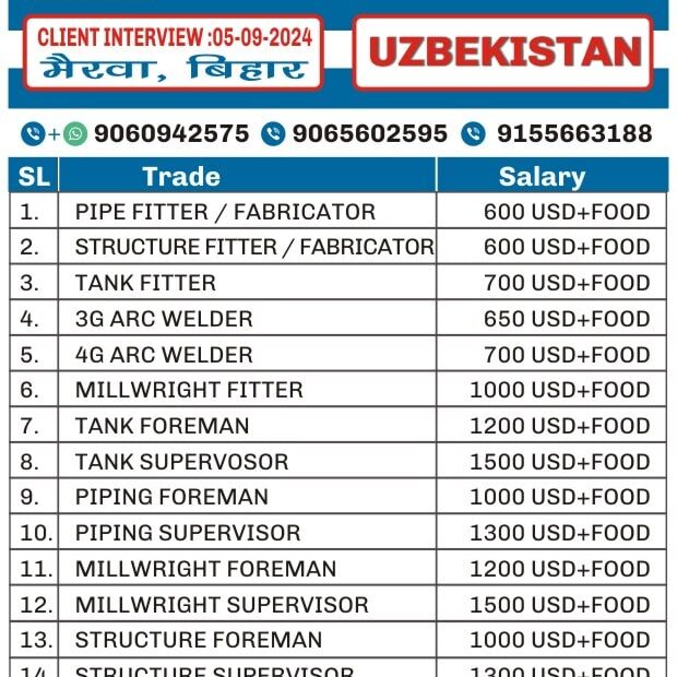 I'm Interested for this jobNot relevant Trade Mobile Number Upload PDF* URGENT REQUIREMENT FOR ARAVIA CONSTRUCTION UZBEKISTAN Client Interview 10-09-2024 SL Trade Salary 1. 3G… Read More »URGENT REQUIREMENT FOR A LEADING COMPANY, UZBEKISTAN – Posted on : 08-09-2024