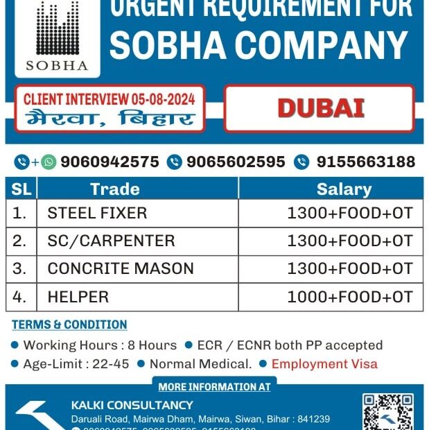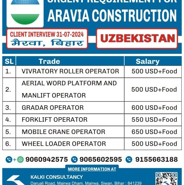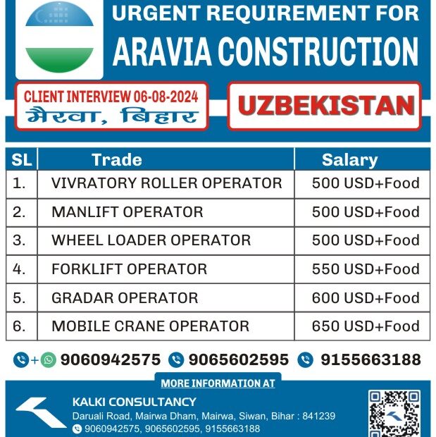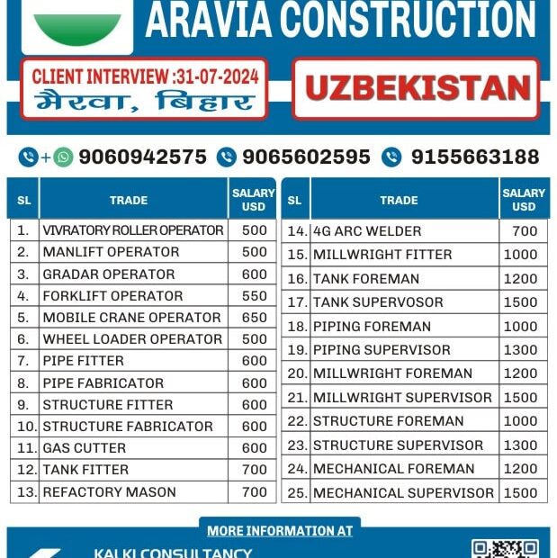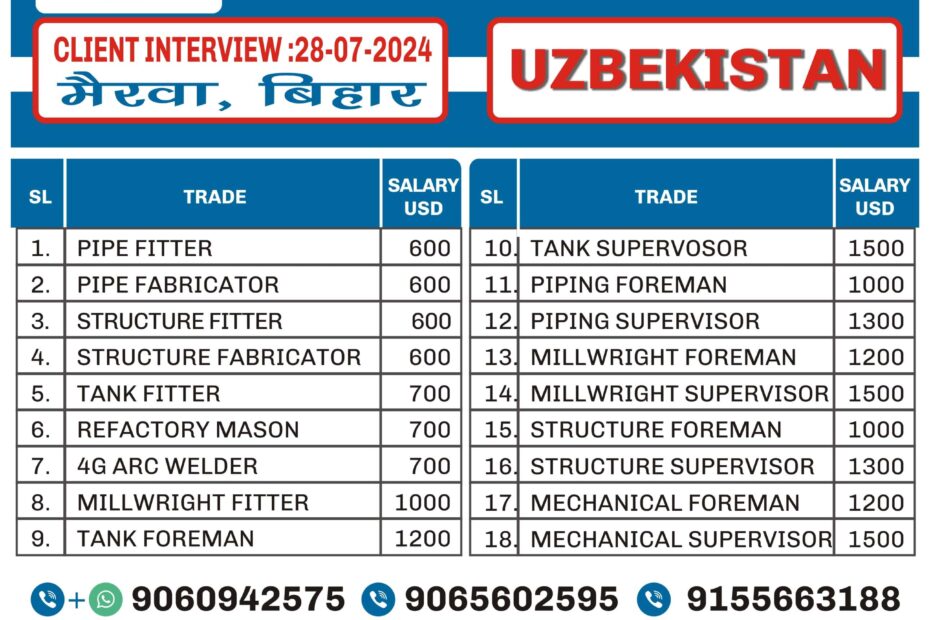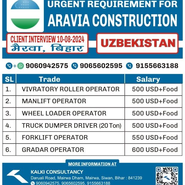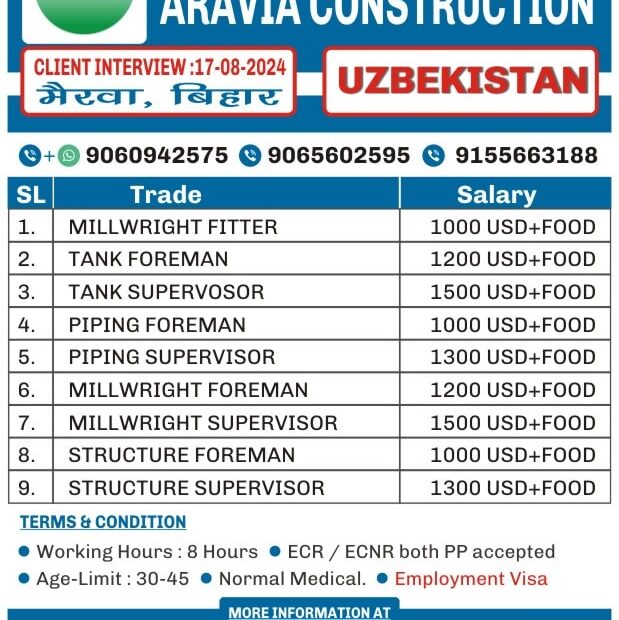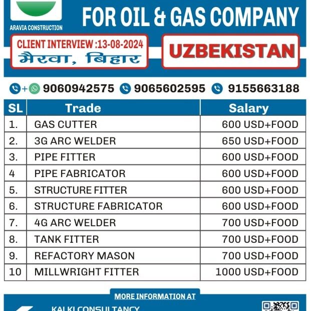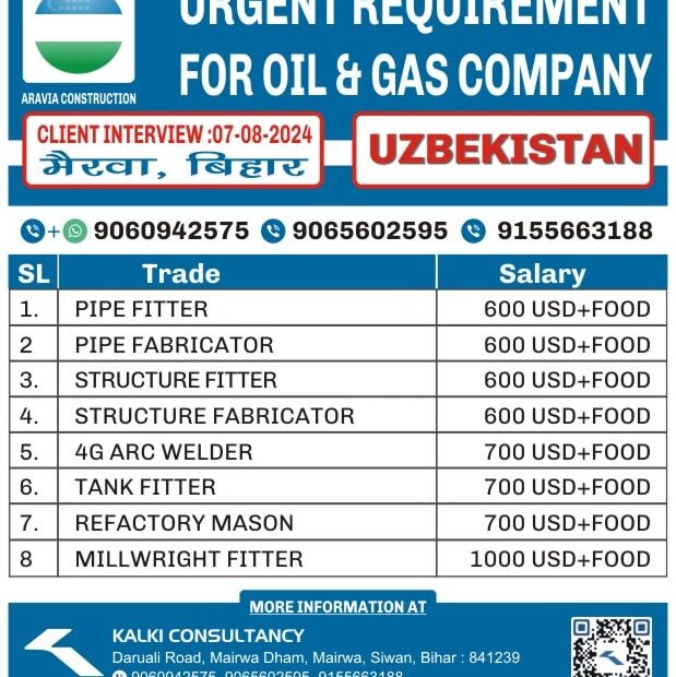 I'm Interested for this jobNot relevant Trade Mobile Number Upload PDF* URGENT REQUIREMENT FOR ARAVIA CONSTRUCTION UZBEKISTAN Client Interview 17-08-2024 SL Trade Salary 1. GAS… Read More »URGENT REQUIREMENT FOR A LEADING COMPANY, UZBEKISTAN – Posted on : 14-08-2024