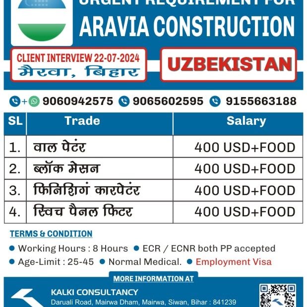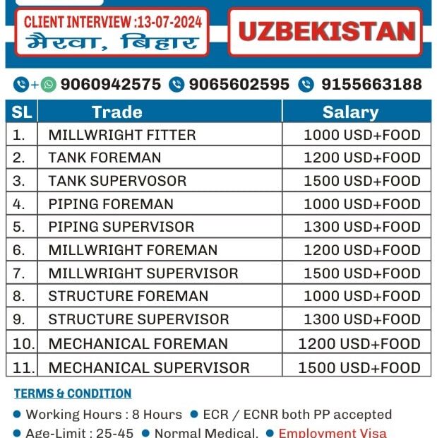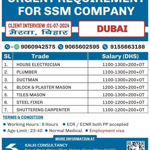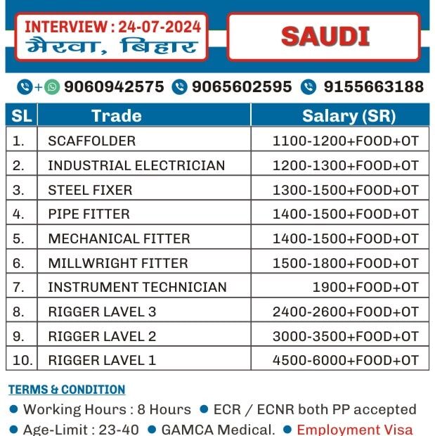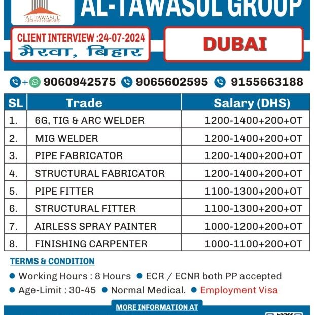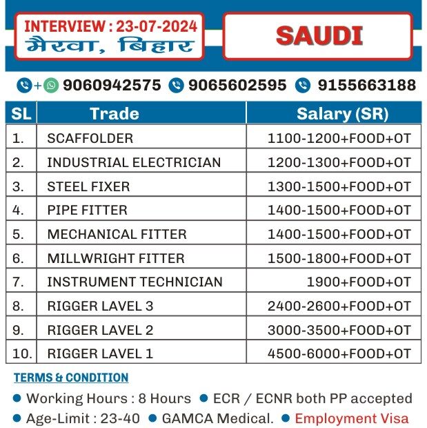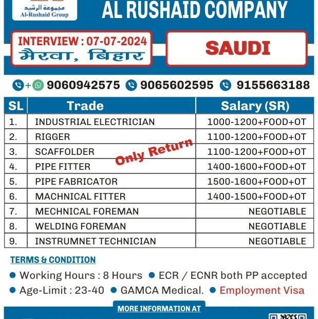 I'm Interested for this jobNot relevant Trade Mobile Number Upload PDF* URGENT REQUIREMENT FOR AL RUSHAID COMPANY SAUDI CLIENT INTERVIEW : 24-07-2024 SL Trade Salary… Read More »URGENT REQUIREMENT FOR A LEADING COMPANY, SAUDI – Posted on : 21-07-2024