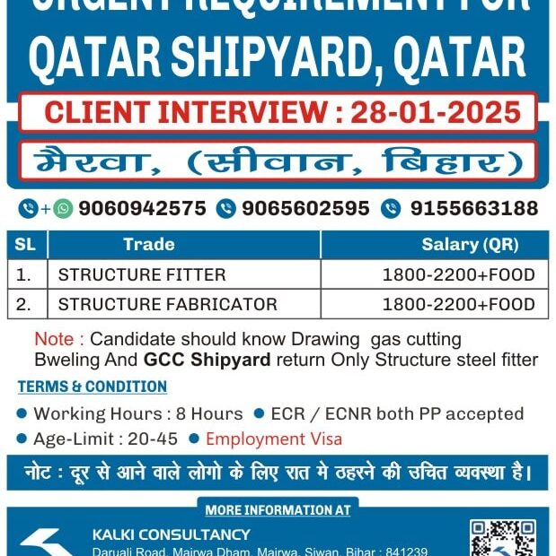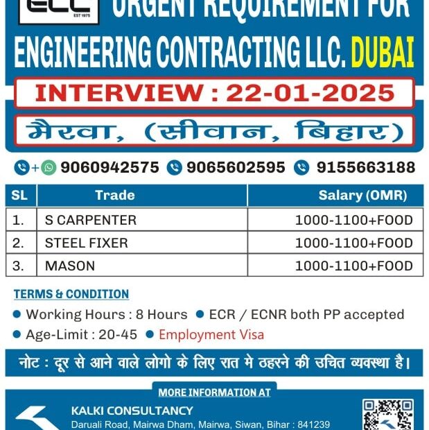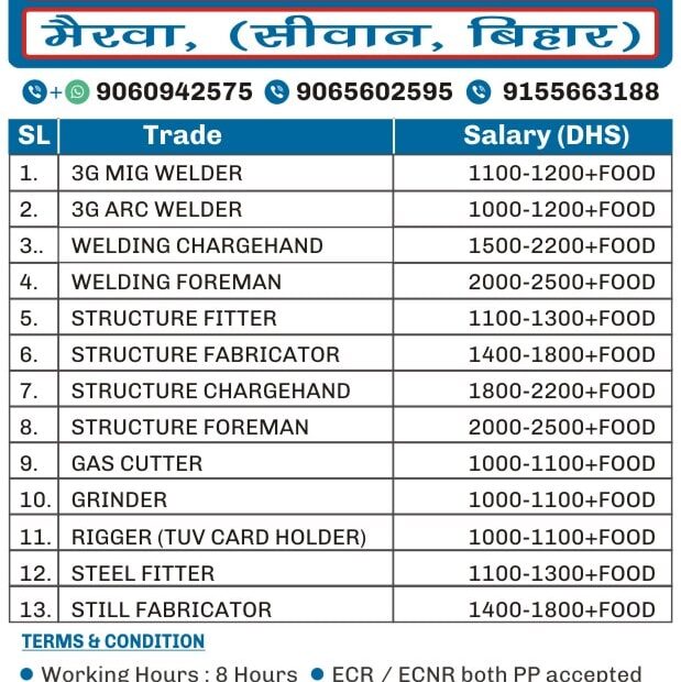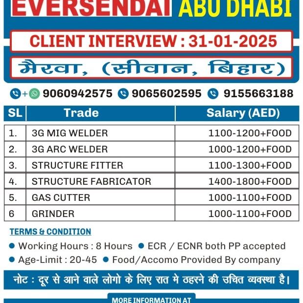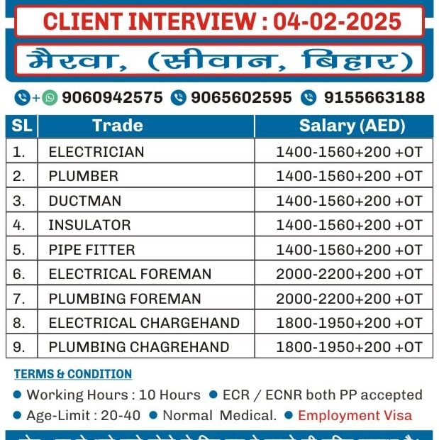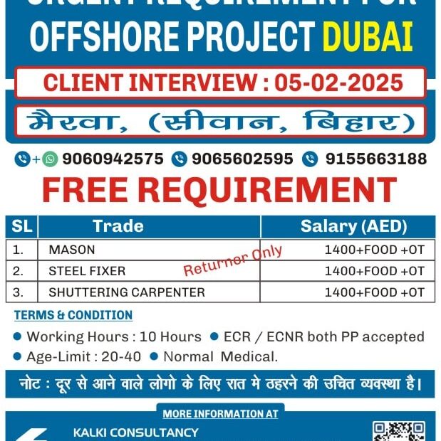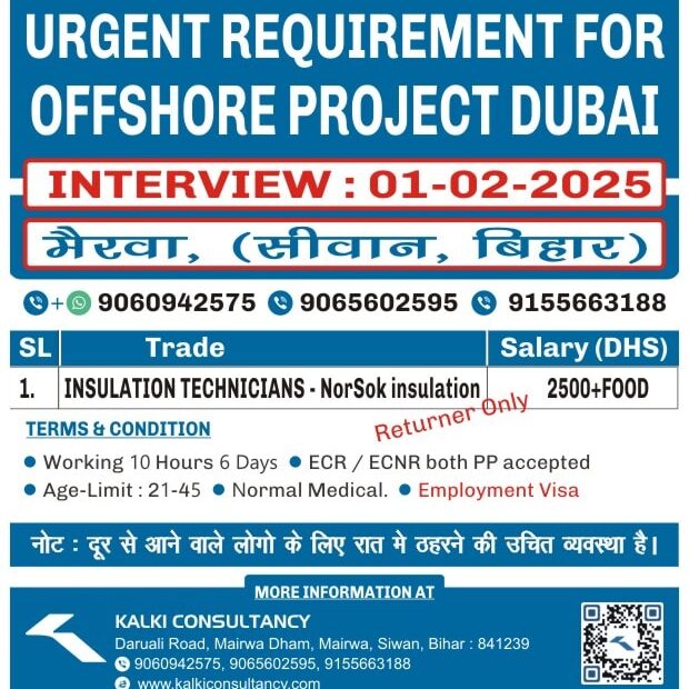 I'm Interested for this jobNot relevant Trade Mobile Number Upload PDF* URGENT REQUIREMENT FOR OFFSHORE PROJECT FREE REQUIREMENT DUBAI Client Interview 05-02-2025 SL Trade Salary… Read More »URGENT REQUIREMENT FOR A LEADING COMPANY, DUBAI – Posted on : 01-02-2025